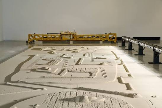 Zijn Erosion Machine (1969) liet toeschouwers letterlijk zien hoe wind, zand en water een landschap vormgeven – een miniatuur natuur in een kast.